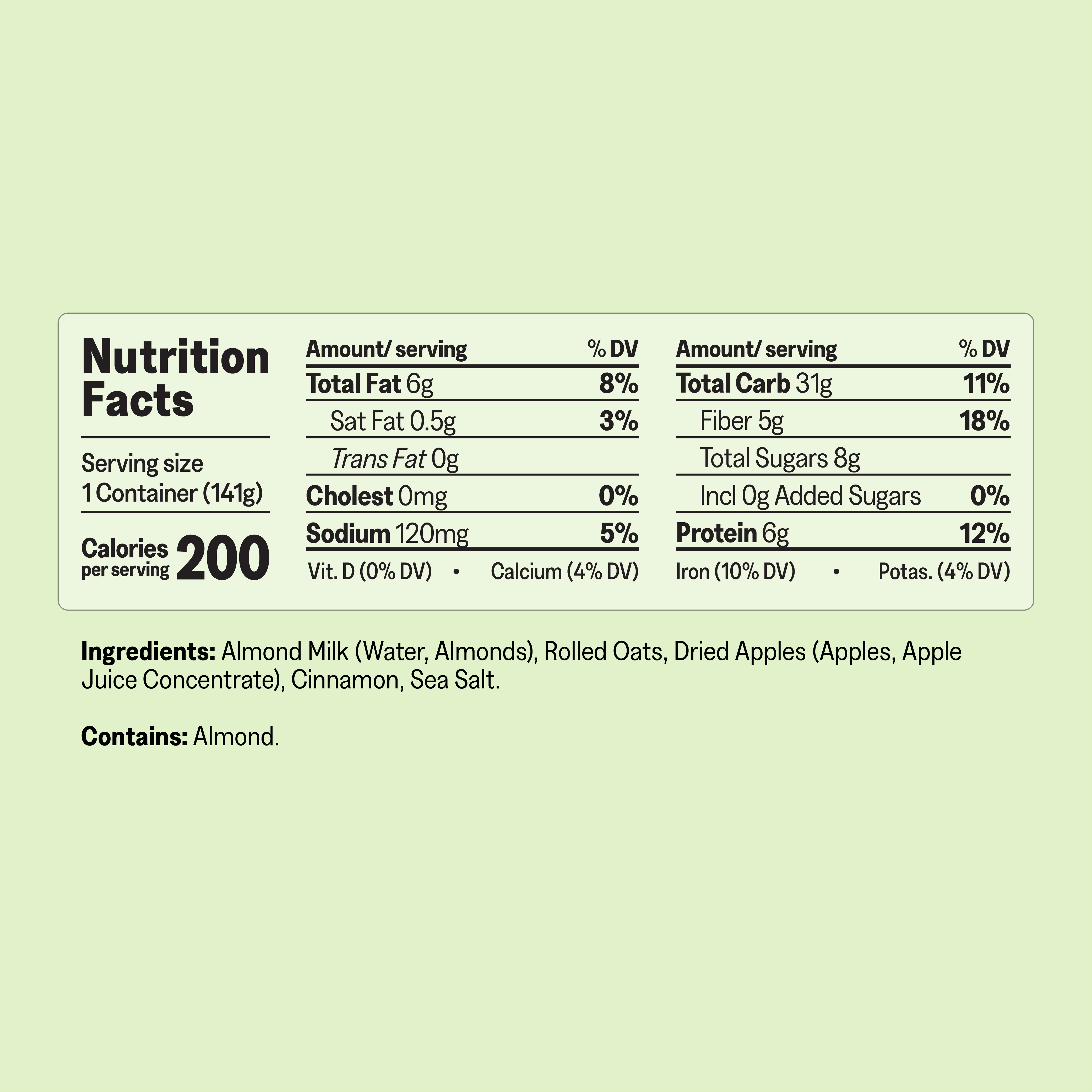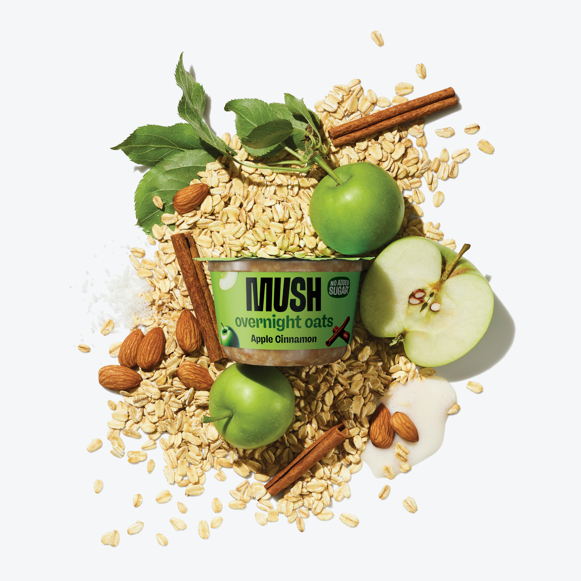 The beloved oatmeal favorite, rebuilt from scratch. MUSH Apple Cinnamon Overnight Oats are a hearty blend of nutrient-dense oats, almond milk, juicy apples, and just the right kick of cinnamon, all with a satisfying pudding-like texture. Plus, 6g of protein, only clean ingredients, and zero added sugar, it ticks all the boxes of an ideal breakfast: Easy, nutritious, delicious. All under one lid.