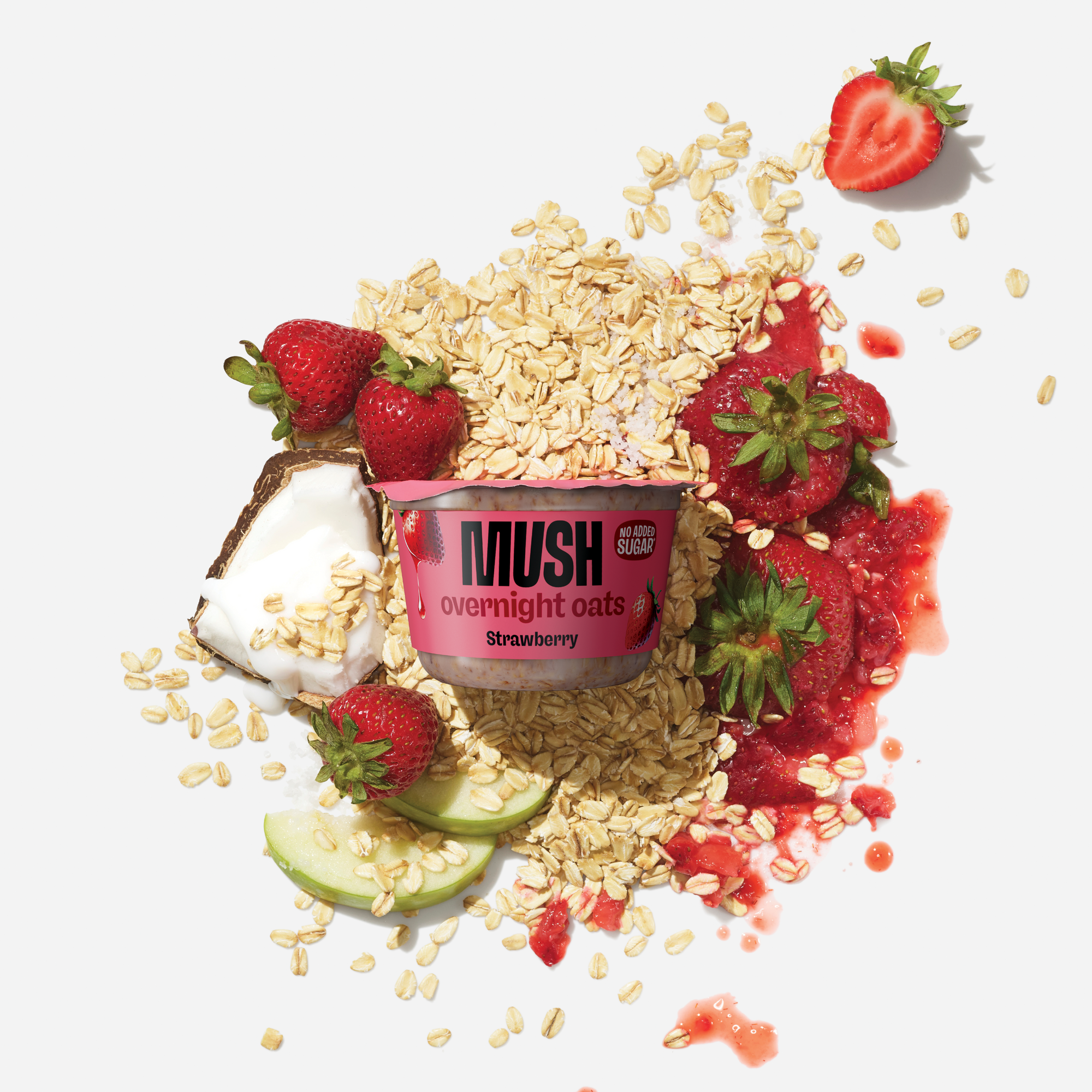 Bright, juicy, and simply delightful. MUSH Strawberry Overnight Oats are the ideal blend of nutritious oats, creamy coconut milk, and a healthy handful of real strawberries. Its pudding-like texture, combined with no added sugar, no artificial anything, and clean ingredients, makes it the stuff good mornings are made of.